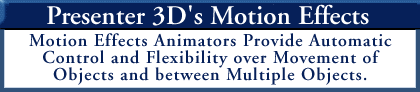 The motion effects animators along with the RealPhysics(tm) properties of Presenter 3D provide automatic control and flexibility over movement of objects and between multiple objects. Included plug-ins are:
