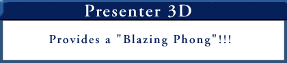 VIDI added a new Phong shader to Presenter 3D that provides extremely fast rendering speed. Users like Bob Sauls and Shelly Green say that it's faster than Electric Image's Phong shader and Eric King says the speed is "downright scary". It offers antialiasing and texture mapping, but no shadows.