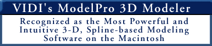 ModelPro is the result of VIDI's engineering technology and years of computer graphics experience. It is recognized as being the most powerful 3-D modeling software on the Macintosh (and many say it rivals anything on a workstation). We have taken the design style of 2-D illustration programs like Freehand and Illustrator and the precision of 3-D CAD to produce a new design paradigm we call 3-D illustration. Plus it offers our powerful "Digital Clay" sculpting feature for pushing, pulling, bending or twisting 3-D shapes to produce 3-D designs and forms characteristic of high-end workstation programs. This rounds out ModelPro as the premier 3-D design tools on the Mac.