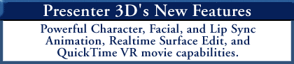 Presenter 3D represents a major upgrade to VIDI's modeling and animation technology and an aggressive commitment to support Apple technology. VIDI is offering the first complete solution for creating QuickTime VR scenes and object movies and is now fully supporting QuickDraw 3D. Multi-target Morphing provides the tools necessary to create rich character and facial animation, and a new visual tool helps fine tune surface attributes, VIDI also further enhances its extensible animation technology with new group motion and particle effect plug-ins.