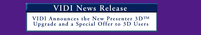 "With the Presenter 3D release, VIDI is elevating the level of 3D modeling and animation", says Nick Pavlovic, VIDI CEO. "Building on our Digital Clay(tm) sculpting and Directional 3D Sound(tm) capabilities, VIDI is introducing powerful Multi-Target Morphing, ground-breaking Explore surface editing, unique motion control plug-ins, and complete QuickTime VR movie generation capabilities. These make high-end effects like the geese flocking scene in Fly Away Home and the lip syncing of Toy Story now readily doable and affordable on the Macintosh. To share the benefits of this new technology, VIDI intends to treat all 3D users as its user base and is making a special upgrade offer that provides its $2,000 product to Strata, Electric Image, Infini-D, and other 3D users for $999, valid through December 31, 1996. In addition to all the new capabilities and a low price, the Presenter 3D upgrade provides many of the promised features that users of other 3D products have been waiting to get from their 3D vendors. These include features like Extrude, Lathe, and Sweep in place with interactive controls and preview, seeing the scene from the point of view of the spotlight or movie projector, and automatic camera edits. These along with Directional 3D Sound have been standard features with VIDI for the past two years."