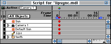 You will notice that the sound starts before the mouth moves at frame 3 and ends at frame 12 before the mouth stops. In Presenter 3D, adjusting the timing of the lip movement is simple. To adjust the start, double-click on the red square event marker on the Lips timeline and drag the "Oh Boy!" sound icon out of the Attributes box to remove it. Double-click on the second red square event marker, select the Sound Attributes under the Window Menu, and drag the "Oh Boy!" sound icon to the Attributes box. This results in the sound starting at frame 3.