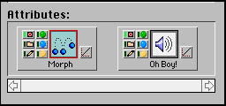 Select Attributes under the Windows menu and select the Sound attributes option to display all the available sound files. Double-click on the Lips object in the Script window to bring up the Lips object dialog. Select the "Oh Boy!" sound icon from the Sound Attributes dialog and drag it next to the Morph icon in the Attributes area, as shown in Fig. 7.